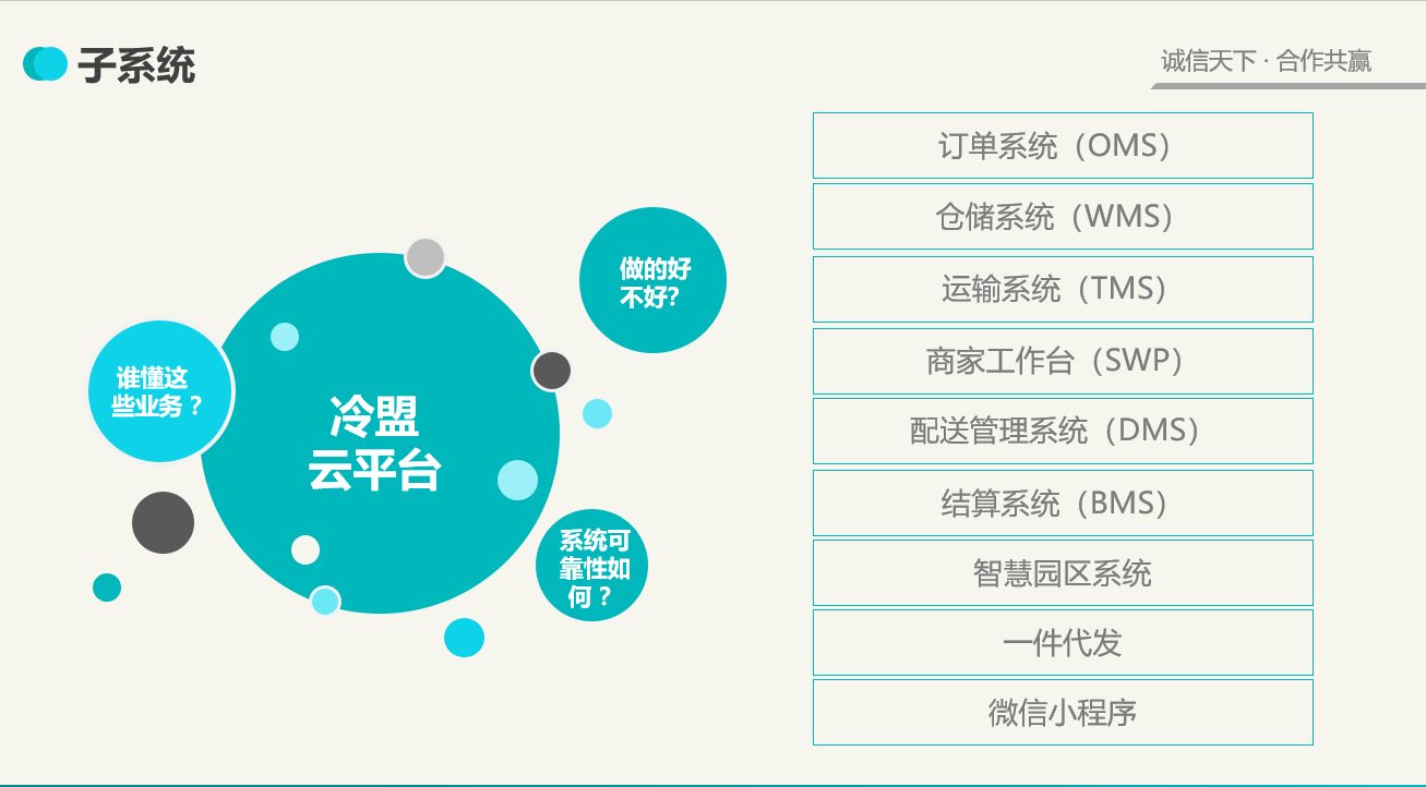 冷盟云平台由9个子系统组成,分别为订单系统(OMS)、仓储系统(WMS)、运输系统(TMS)、商家工作台(SWP)、配送管理系统(DMS)、结算系统(BMS)、智慧园区系统、订单一件代发、微信小程序。9个子系统功能为企业提供了全面的订单管理,操作人员管理、库存、供应链的执行管理等,让企业应对客户的个性化需求和多种多样的货物种类拥有快速、高效、准确的处理业务的能力,以满足企业各种业务场景要求。