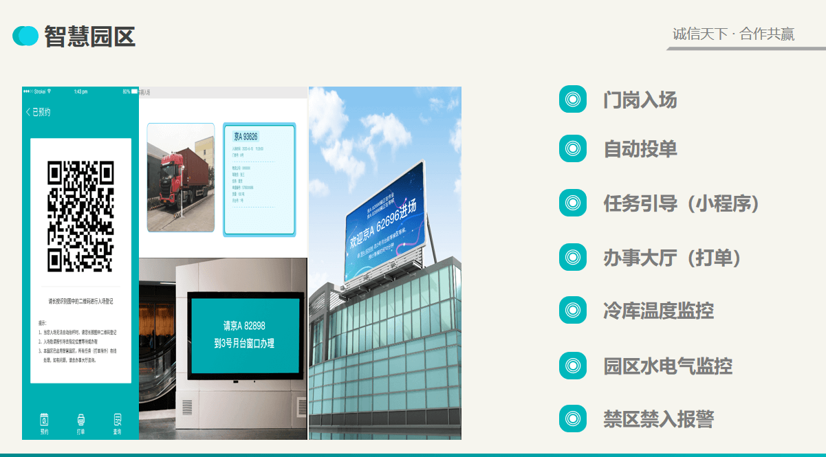 冷盟云平台智慧园区,含门岗入场、自动投单、任务引导(小程序)、办事大厅(打单)、冷库温度监控、园区水电气监控、禁区禁入报警。